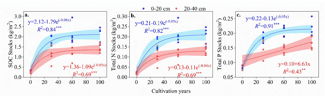 中國科學院西北生態(tài)環(huán)境資源研究院科研團隊對張掖綠洲區(qū)不同開墾年限農田土壤的碳儲量和養(yǎng)分儲量進行了探究,通過回歸分析揭示了碳庫和養(yǎng)分庫隨常規(guī)耕作年限的變化模式,并結合隨機森林模型等分析了影響碳庫和養(yǎng)分庫的關鍵因子。研究發(fā)現(xiàn),沙漠開墾后0-40 cm土壤碳庫擴大了4.2倍,氮儲量和磷儲量增加了1.2-6.5倍。然而,回歸分析表明碳儲量和養(yǎng)分儲量均隨耕作年限的增加呈指數變化模式,在常規(guī)耕作60年后,0-40 cm土層的碳庫和氮儲量及表層土壤中的磷儲量停止增長。土壤化學計量、pH和機械組成是影響綠洲農田土壤碳庫和養(yǎng)分庫的關鍵因素。研究表明,雖然沙漠開墾后土壤質量得到了顯著改善,但長期的常規(guī)管理措施限制了改良效應,因此,干旱區(qū)綠洲農田的常規(guī)管理措施中應適當引入保護性耕作措施,以實現(xiàn)農田土壤的可持續(xù)生產。