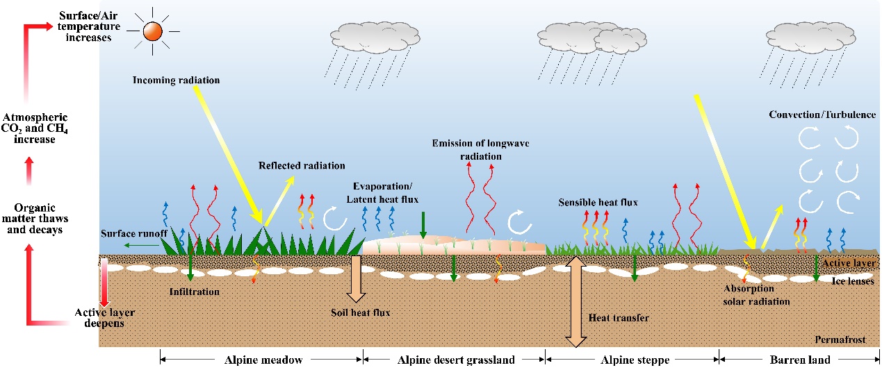 圖1 不同高寒草地類型對(duì)地表水熱交換的影響以及多年凍土融化釋放碳