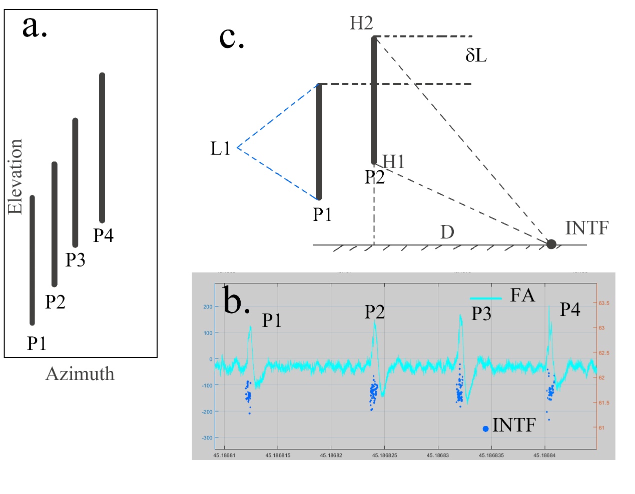 圖2. VHF干涉儀(Fan et al.,2023a;2023b)對(duì)規(guī)則脈沖爆發(fā)序列中連續(xù)脈沖的二維觀測(cè)結(jié)果,顯示這些脈沖比正常的直竄先導(dǎo)速度更快,并且從一個(gè)脈沖到另一個(gè)脈沖之間重疊較強(qiáng)?。╝)。從平面距離 D?。健?.8 公里和干涉儀仰角的差異(例如,60.5° 和 60°),可以得出脈沖的 VHF輻射源的垂直范圍約為 205 米 (c)。這一現(xiàn)象發(fā)生在約 2 微秒的時(shí)間間隔內(nèi),對(duì)應(yīng)的速度約為 108 米/秒。脈沖代表的擊穿速度遠(yuǎn)高于已知的閃電先導(dǎo)通道發(fā)展速度。
