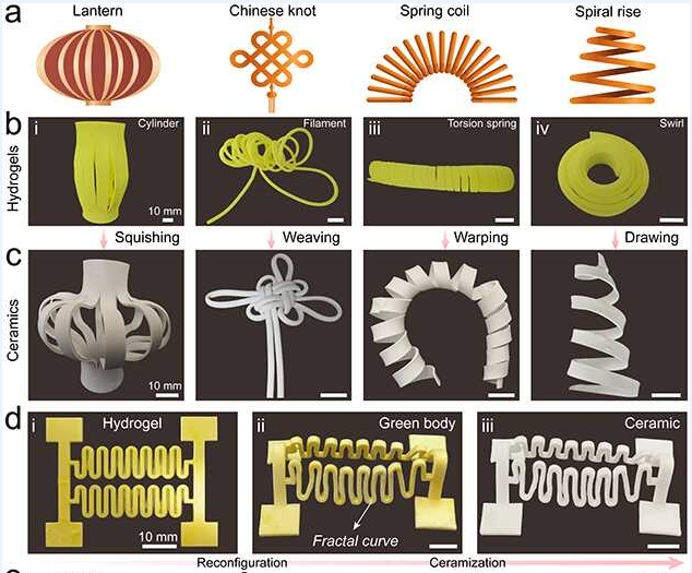 近日,中國科學(xué)院蘭州化學(xué)物理研究所潤滑材料重點(diǎn)實(shí)驗(yàn)室3D打印摩擦器件組在采用3D打印柔性水凝膠前驅(qū)體制備復(fù)雜結(jié)構(gòu)陶瓷方面取得重要進(jìn)展。該團(tuán)隊(duì)發(fā)展了利用3D 打印水凝膠柔性骨架輔助高幾何復(fù)雜性、高打印精度和形狀保真度陶瓷成形的新方案,解決了傳統(tǒng)陶瓷制造中因脆性和剛性導(dǎo)致的形狀復(fù)雜性和尺寸收縮問題,展示了在立體電路、生物醫(yī)學(xué)和功能催化等領(lǐng)域廣泛的應(yīng)用前景。