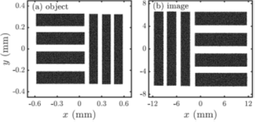 鑒于有源等離子體透鏡具有緊湊、聚焦梯度大、對稱聚焦、色差小的優(yōu)勢,科研人員將該透鏡成功應用到高能電子成像中。從高能電子束在透鏡中的傳輸矩陣出發(fā),科研人員設計了一個總長為44.87cm、放大倍數(shù)為20的高能電子成像系統(tǒng),其點對點成像模擬結果如圖2所示。模擬結果表明:該系統(tǒng)的成像分辨率可以達到亞微米量級,相較于基于電磁四極鐵的全長為5m(放大倍數(shù)為10)的成像系統(tǒng)十分緊湊。