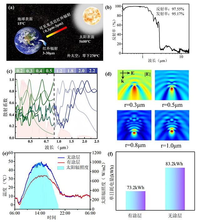 圖2. (a) 構(gòu)建地球-太陽-外太空能源利用體系;(b) 輻射制冷涂層反射光譜;(c) 不同粒徑光學(xué)材料對0.5μm入射光的散射系數(shù)和(d) 電場分布;(e) 2024年8月18日06:00-19日06:00,太陽輻照度及儲能集裝箱表面溫度變化和(f) 空調(diào)制冷耗電量變化