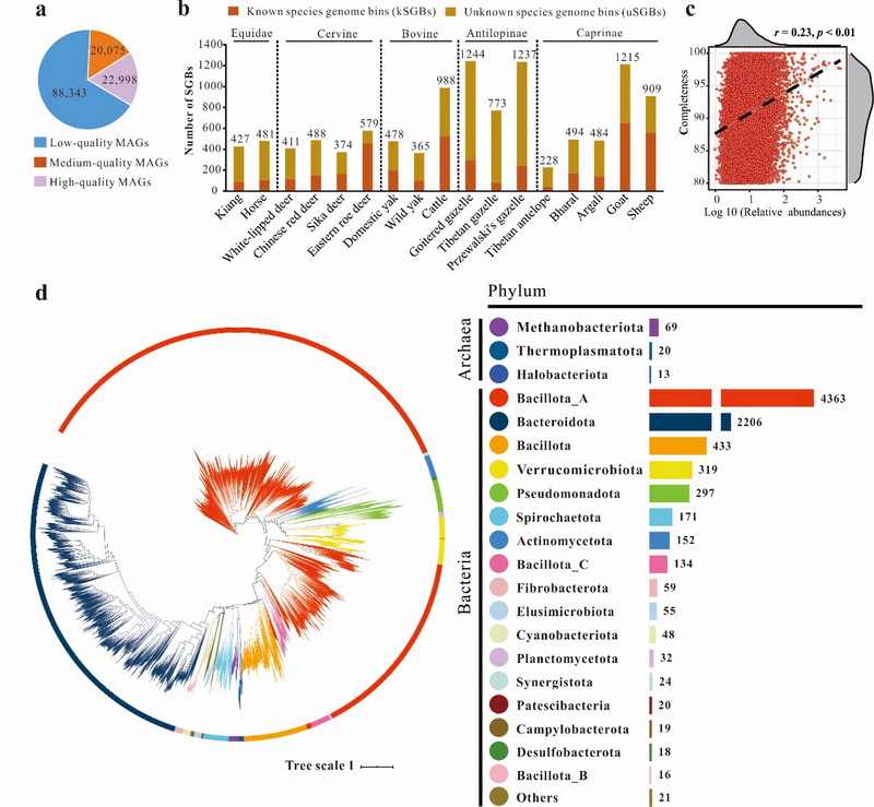 中國科學院西北高原生物研究所動物生態(tài)與資源保護研究團隊以中國境內(nèi)奇蹄目(Perissodactyla)和鯨偶蹄目(Cetartiodactyla)17個常見有蹄類物種為研究對象,通過大規(guī)模宏基因組測序和組裝、分箱和注釋,獲得131,416個宏基因組組裝基因組(MAGs),其中包含22,998個高質(zhì)量MAGs和11,175個菌種水平基因組(SGBs),成功構建了中國典型有蹄類物種的腸道微生物宏基因組圖譜,其中60%左右的SGBs為本研究首次報道。
