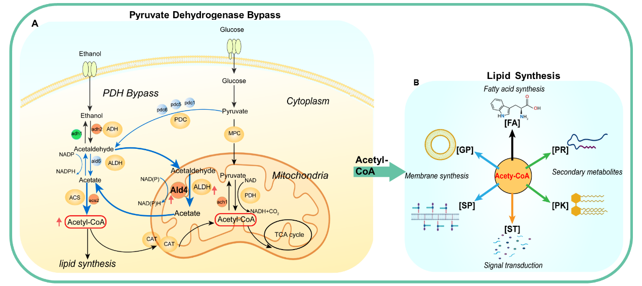 基于此現(xiàn)狀,科研人員利用蘭州重離子加速器(HIRFL)對目標突變體實施多輪輻射,結(jié)合ALE技術提高了酵母的抗逆性和耐受性,因此獲得了適應性更強的底盤細胞。再通過多組學聯(lián)合分析方法識別出與其發(fā)酵性能相關的重要基因,利用基因編輯技術對代謝通路進行精準優(yōu)化,著重優(yōu)化了核心代謝中間產(chǎn)物的代謝通量,使乙酰輔酶A水平較之前提高了17.10%,從而顯著提高了酵母在合成脂類和其他高附加值化合物方面的產(chǎn)量。