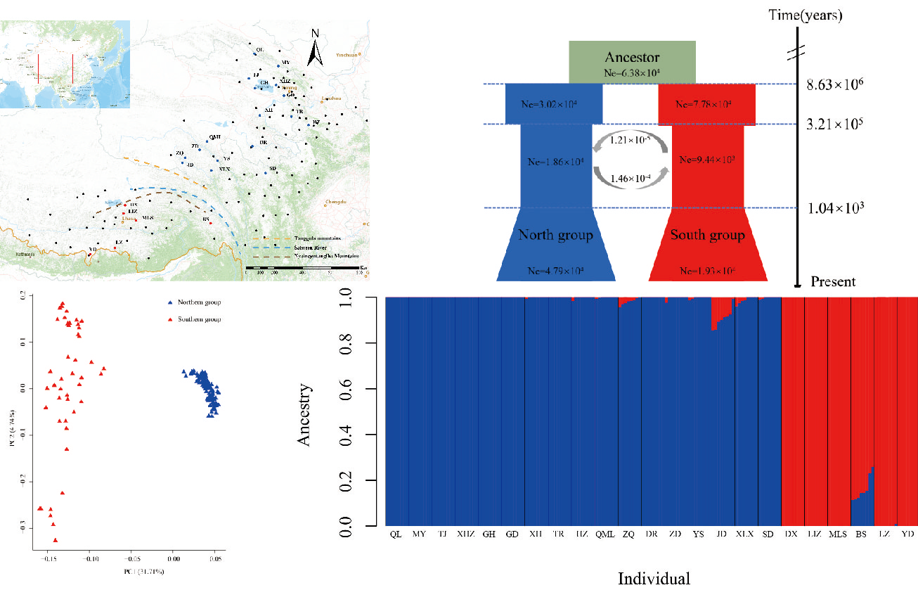 中國科學(xué)院西北高原生物研究所青藏高原植物適應(yīng)與進(jìn)化研究團(tuán)隊利用簡化基因組測序技術(shù),對覆蓋青藏高原地區(qū)的23個居群183份肉果草樣本進(jìn)行測序分析。結(jié)果顯示肉果草分為北部和南部兩個群體,其分界線與唐古拉山、念青唐古拉山及怒江的地理屏障高度吻合。群體歷史模擬表明,約30萬年前該物種經(jīng)歷了種群瓶頸事件,此后南北群體間出現(xiàn)持續(xù)基因流,且有效種群大小呈現(xiàn)緩慢增長趨勢。物種分布模型分析結(jié)果表明,海拔是影響肉果草分布的主導(dǎo)因素,其次為降水量和溫度。未來氣候變暖情景下,其適宜生境預(yù)計縮減40%-60%,并向高海拔區(qū)域遷移。當(dāng)前,過度采挖與生境破碎化嚴(yán)重威脅肉果草生存,亟需優(yōu)先保護(hù)高遺傳多樣性核心種群,并推動規(guī)范化人工栽培以保障資源可持續(xù)利用。