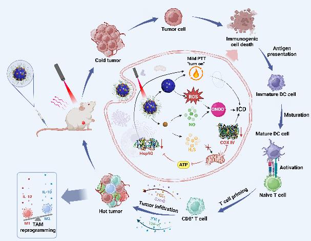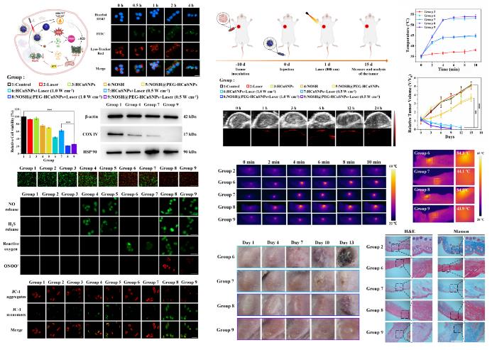該研究利用雙模態(tài)探針和熒光-質(zhì)譜成像聯(lián)用動(dòng)態(tài)可視化技術(shù),揭示了三重協(xié)同抗腫瘤的作用機(jī)制。結(jié)果表明,利用納米馬達(dá),通過中空硫化銅納米顆粒HCuSNPs負(fù)載氣體信號(hào)分子供體NOSH,在808 nm激光照射下可控釋放H?S/NO,同時(shí)高效轉(zhuǎn)換光能(光熱轉(zhuǎn)化效率達(dá)27.8%),確保局部溫度維持在45℃以下,既能殺傷腫瘤細(xì)胞,又避免正常組織損傷。此外,該納米馬達(dá)不僅通過H?S阻斷線粒體能量代謝、NO-ROS反應(yīng)生成ONOO?雙路徑誘導(dǎo)腫瘤凋亡,還可顯著重塑腫瘤免疫微環(huán)境,促進(jìn)M1型巨噬細(xì)胞極化(比例提升3倍)、CTLs浸潤(rùn)(增加5倍),全面提升免疫抗癌能力。