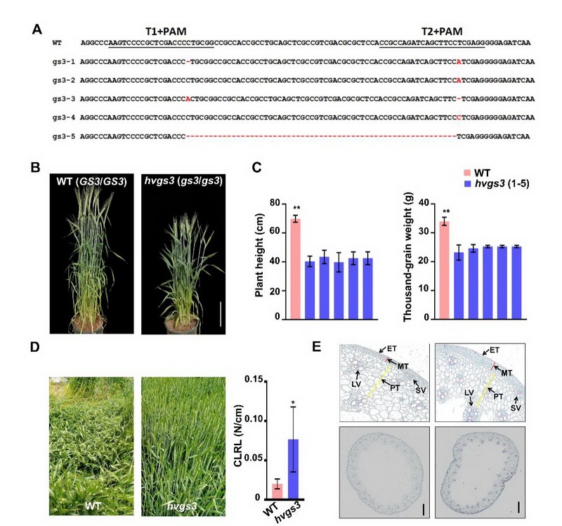 Gγ亞基在多種生物過(guò)程中發(fā)揮著重要作用,但其在大麥中的具體功能尚未完全明確。為了深入研究這一問(wèn)題,中國(guó)科學(xué)院西北高原生物研究所高原作物種質(zhì)資源創(chuàng)新與利用研究團(tuán)隊(duì)利用CRISPR/Cas9技術(shù)敲除大麥品種Golden Promise中的HvGS3基因,并通過(guò)詳細(xì)的表型分析比較了突變體hvgs3與野生型之間的株高、穗長(zhǎng)和千粒重等農(nóng)藝性狀。結(jié)果顯示,突變體hvgs3的株高比野生型降低了37.8%至43.1%,同時(shí)倒二節(jié)的抗倒伏指數(shù)提高了76.6%。進(jìn)一步分析發(fā)現(xiàn),突變體hvgs3的莖節(jié)細(xì)胞長(zhǎng)度顯著縮短,導(dǎo)致株高降低。突變體hvgs3的木質(zhì)素合成通路被激活,木質(zhì)素含量比野生型增加了22%,基部第二節(jié)間的維管束數(shù)量、機(jī)械組織厚度均高于野生型,從而增強(qiáng)了莖稈的機(jī)械強(qiáng)度。通過(guò)CRISPR/Cas9技術(shù)成功敲除HvGS3基因,我們創(chuàng)制了一種具有矮化和抗倒伏特性的大麥新種質(zhì)資源,株高的降低和莖稈強(qiáng)度的增加共同提升了其抗倒伏性能。該研究不僅揭示了大麥HvGS3基因的功能,還為培育抗倒伏、高產(chǎn)的大麥品種提供了寶貴的理論依據(jù)和技術(shù)支持。