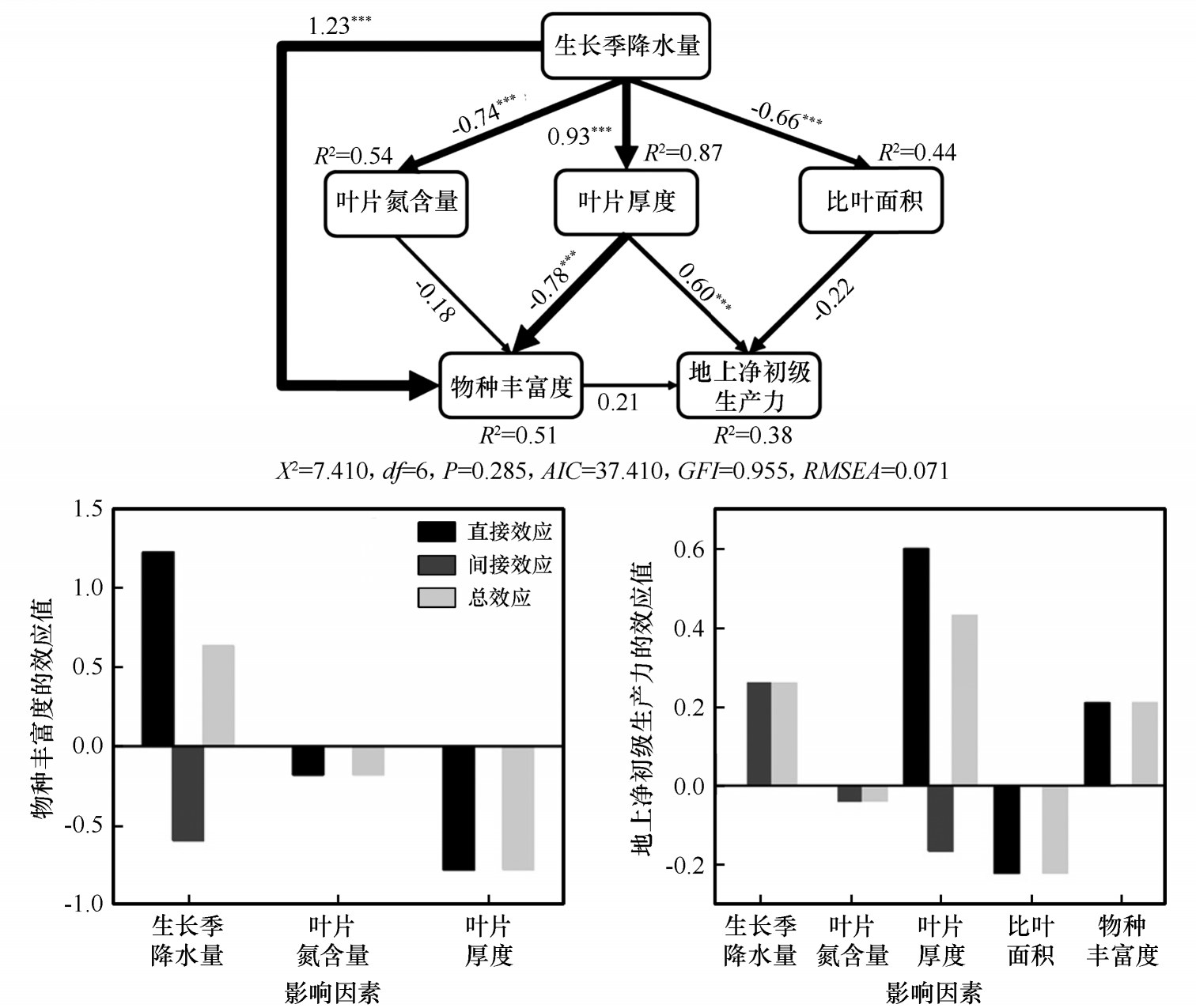 生長(zhǎng)季降水對(duì)退化植被恢復(fù)過(guò)程中植物多樣性和生產(chǎn)力影響的結(jié)構(gòu)方程模型效應(yīng)值