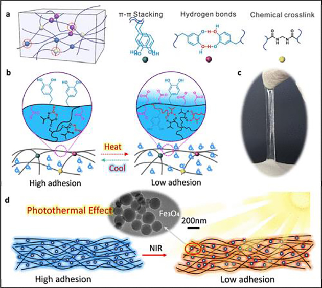 研究人員進(jìn)一步揭示了其作用機(jī)制,通過近紅外光激發(fā)納米顆粒產(chǎn)生熱效應(yīng),誘導(dǎo)水凝膠發(fā)生溫度響應(yīng)性相變,實(shí)現(xiàn)軟物質(zhì)表面水分子的滲出/吸收,改變其表面親水羧酸基團(tuán)的分子構(gòu)象,進(jìn)而可逆地控制鄰苯二酚基團(tuán)的屏蔽和暴露。這種基于界面分子構(gòu)象變化調(diào)控的黏附機(jī)制具有無殘留、可重復(fù)使用的特點(diǎn),為智能黏附材料的開發(fā)提供了新思路。