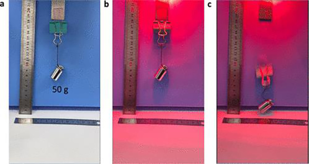 此外,該黏附水凝膠材料表現(xiàn)出優(yōu)異的智能黏附性能和廣泛的基材適用性,實(shí)現(xiàn)了從無機(jī)到有機(jī)材料表面的可逆黏附。為進(jìn)一步驗證黏附水凝膠材料的可控性,研究人員實(shí)驗演示了水凝膠在不銹鋼基板上的光熱響應(yīng)行為,初始狀態(tài)下可穩(wěn)定懸掛50g重物,近紅外光照后因黏附性能切換而黏附失效。