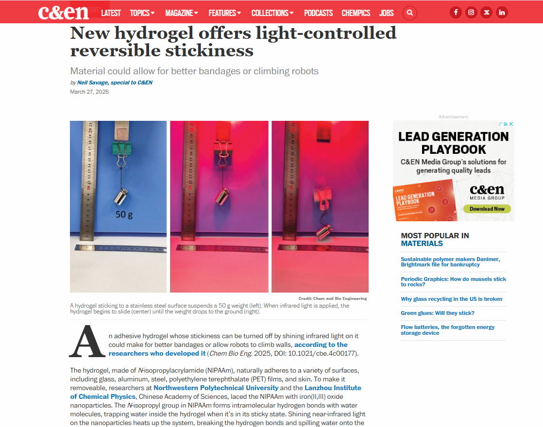 相關(guān)研究成果以“Light-controlled Adhesive Hydrogels for On-Demand Adhesion”為題發(fā)表在Chem & Bio Engineering上。同時,該成果已被美國化學(xué)學(xué)會發(fā)行的新聞周刊chemical?&?engineering?news(C&EN,全球最具權(quán)威和影響力的化學(xué)新聞來源之一。)以“New?hydrogel?offers?light-controlled?reversible?stickiness”為題報道。