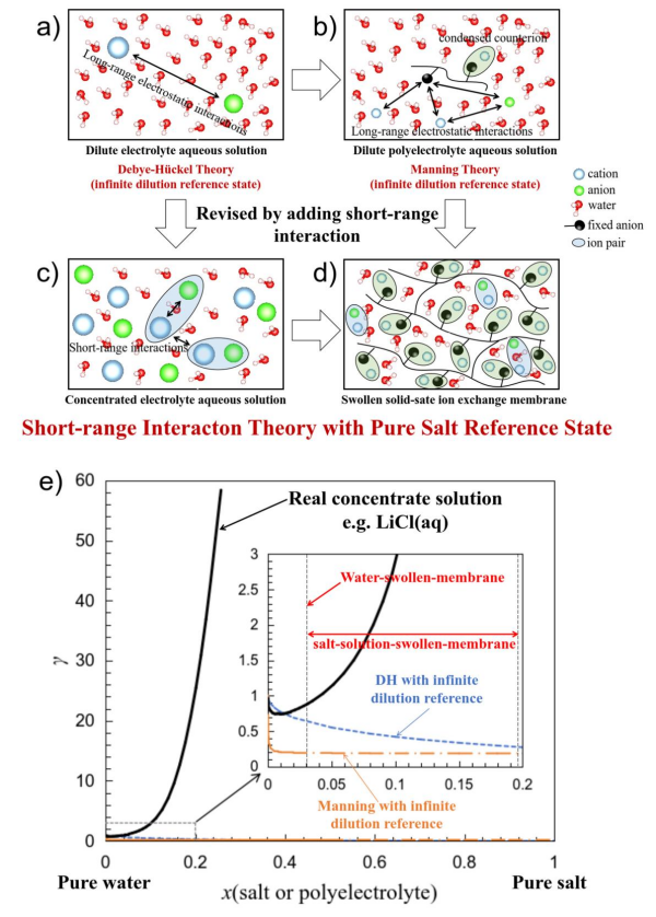受Kenneth S. Pitzer濃電解質(zhì)溶液理論啟發(fā),研究人員認(rèn)為:離子交換膜的反離子凝聚效應(yīng)相較曼寧理論所描述的稀聚電解質(zhì)溶液要強(qiáng)的多;在純水溶脹的離子交換膜中,絕大多數(shù)的反離子處于凝聚狀態(tài),有效的屏蔽了聚合物鏈上的電荷。因此,自由離子之間的短程作用,而非長程靜電作用,才是決定性的。這點(diǎn)與忽略長程靜電作用的濃電解質(zhì)溶液理論完全一致。據(jù)此,研究人員創(chuàng)新性提出了"純水溶脹膜參考態(tài)"——首次明確區(qū)分了膜內(nèi)反離子與溶液相中反離子的標(biāo)準(zhǔn)化學(xué)勢(shì)。
