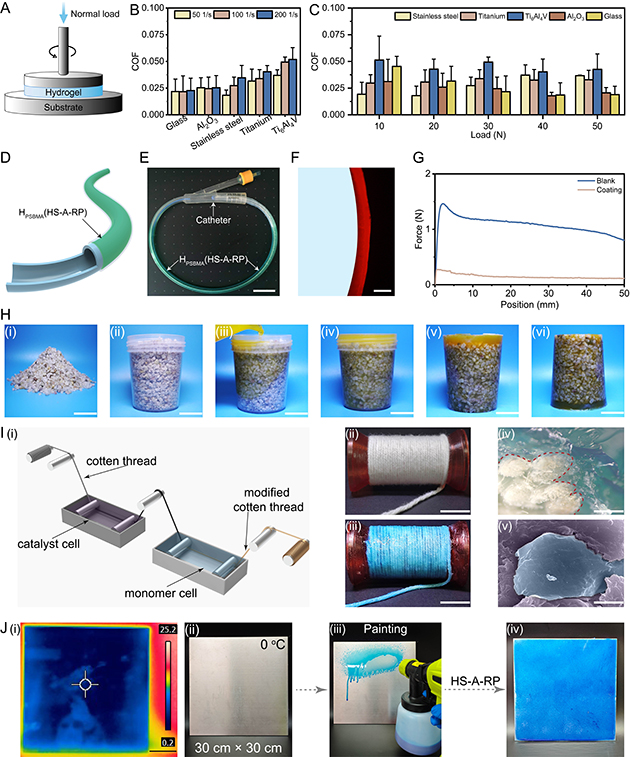 與傳統(tǒng)光/熱引發(fā)體系相比,HS-A-RP 制備的聚兩性離子水凝膠不僅具有更致密的網(wǎng)絡(luò)結(jié)構(gòu)和更好的機(jī)械性能,還展現(xiàn)出了優(yōu)異的抗溶脹、潤(rùn)滑、抗菌和防污性能。通過HS-A-RP方法制備的聚兩性離子水凝膠既能夠作為功能涂層有效改善生物醫(yī)用器械的表面潤(rùn)滑性,又能實(shí)現(xiàn)對(duì)熱敏材料和砂礫的原位封裝。此外,快速凝膠化和寬溫域內(nèi)可反應(yīng)的特性使HS-A-RP能夠在不同基底表面和極端穩(wěn)定環(huán)境條件下規(guī)?;苽渚蹆尚噪x子水凝膠涂層。該方法不僅為聚兩性離子水凝膠的化學(xué)合成提供了新途徑,還極大地拓展了其在生物醫(yī)療、工程裝備等領(lǐng)域應(yīng)用領(lǐng)域。