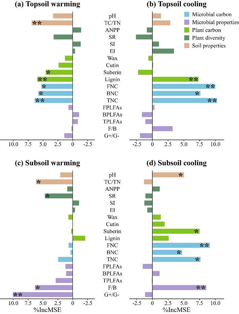 研究發(fā)現(xiàn),高寒草甸亞表層土壤有機(jī)碳對增溫、降溫的響應(yīng)較表層更為敏感,無論是增溫還是降溫,均未引起亞表層土壤中植物和微生物源碳組分的顯著變化。然而,增溫使真菌與細(xì)菌生物量比值(F/B)和革蘭氏陽性細(xì)菌與革蘭氏陰性細(xì)菌生物量比值(G+/G-)分別增加15.0%和8.6%,而降溫則使其分別降低4.5%和9.6%。進(jìn)一步分析發(fā)現(xiàn),增溫主要通過增加F/B和G+/G-直接減少土壤有機(jī)碳庫的積累,同時(shí)降低土壤碳氮比間接減少亞表層土壤有機(jī)碳含量,而降溫則主要通過降低F/B增加亞表層土壤有機(jī)碳含量。如果只考慮增溫而不考慮降溫的作用,傳統(tǒng)的增溫控制實(shí)驗(yàn)可能會(huì)低估氣候變暖對高寒草地亞表層土壤有機(jī)碳庫的消極作用。該研究為更好地解釋和預(yù)測未來氣候變化背景下高寒草地生態(tài)系統(tǒng)土壤碳庫的形成與變化提供了新的理論依據(jù)。