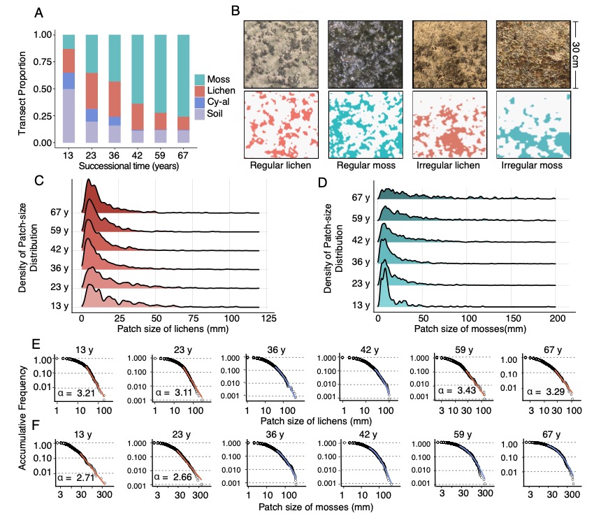 研究團隊采用了計算建模與全局-局部耦合的野外調(diào)查相結(jié)合的研究方法。理論建?;诟怕实脑詣訖C(Cellular automaton)模型的開發(fā),模擬了地衣和蘚類斑塊的動態(tài)變化。野外觀測在中國科學院沙坡頭沙漠試驗研究站進行,通過在不同演替階段的人工固沙植被帶中設置樣線,記錄了生物結(jié)皮的覆蓋度、組成和斑塊大小分布。研究通過對冪律分布的擬合,從全局尺度檢測主導生物結(jié)皮動態(tài)的反饋模式。通過不同演替階段和不同斑塊大小下生物結(jié)皮斑塊中心與邊緣之間的生長差異比較,從斑塊尺度驗證局部自組織過程,對比模擬結(jié)果揭示了生物結(jié)皮自組織機理及其生態(tài)意義。