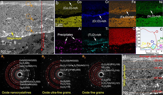 近日,中國(guó)科學(xué)院蘭州化學(xué)物理研究所潤(rùn)滑材料全國(guó)重點(diǎn)實(shí)驗(yàn)室高溫摩擦學(xué)課題組與香港城市大學(xué)機(jī)械工程系先進(jìn)結(jié)構(gòu)材料課題組,在長(zhǎng)期合作基礎(chǔ)上提出了一種基于晶體-非晶異質(zhì)結(jié)構(gòu)與梯度納米氧化層協(xié)同調(diào)控的高熵納米復(fù)合材料設(shè)計(jì)策略。團(tuán)隊(duì)設(shè)計(jì)制備了一種Co25Ni23Cr20Fe20Ti6Al4B2高熵納米復(fù)合材料,包含高密度Ti–O富集非晶納米析出相的多級(jí)異質(zhì)結(jié)構(gòu)。在1000 ℃和較高接觸應(yīng)力條件下,該材料表面原位生成微米級(jí)厚度的梯度納米釉質(zhì)層,其晶粒尺寸沿深度方向從表面25nm漸增至基體112nm,實(shí)現(xiàn)了應(yīng)變逐層協(xié)調(diào)與應(yīng)力有效緩解。得益于這一結(jié)構(gòu)演化,該材料在1000 °C實(shí)驗(yàn)中獲得了-2.3×10-6mm3/Nm的穩(wěn)定負(fù)磨損率與0.26的低摩擦系數(shù),刷新了金屬基抗磨材料的高溫性能紀(jì)錄。
