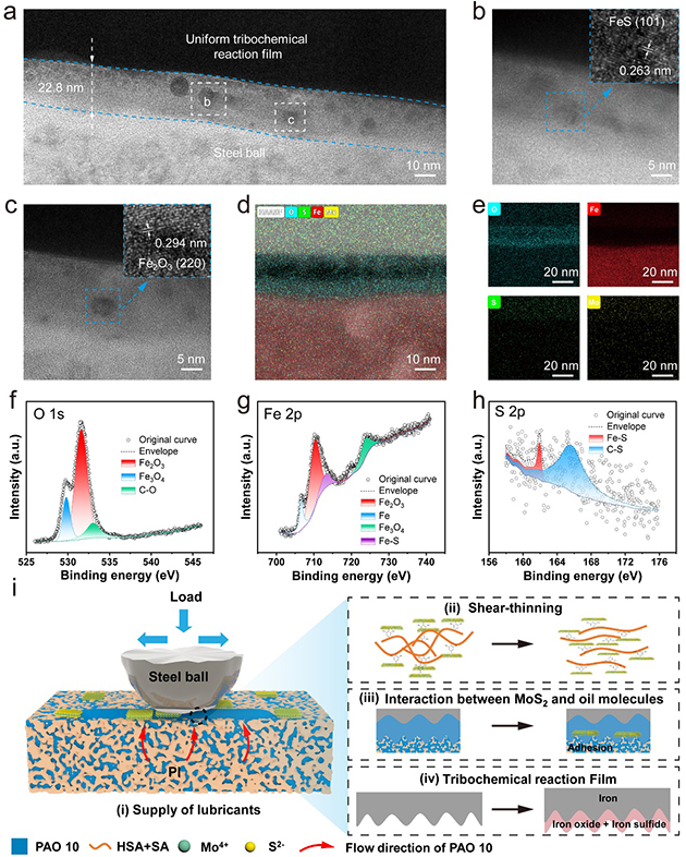鋼/PPI界面宏觀超潤(rùn)滑機(jī)理可歸因于四種機(jī)制的耦合作用,多孔結(jié)構(gòu)的儲(chǔ)油/釋放、潤(rùn)滑劑的剪切變稀特性、功能化的二硫化鉬與油分子之間的相互作用以及摩擦保護(hù)膜的形成(圖2)。
