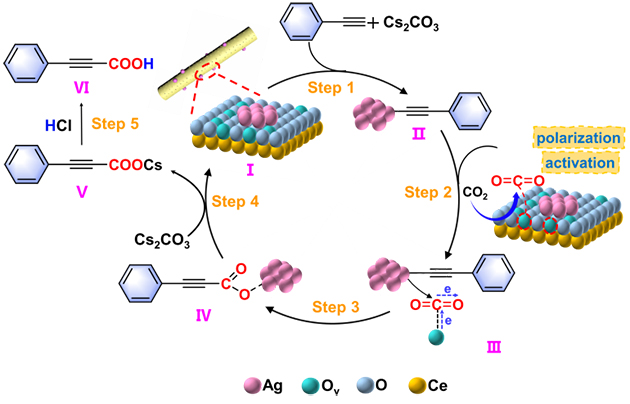基于上述研究,對反應機理做出了闡釋(見圖2),在Cs2CO3的協(xié)助下,苯乙炔中的酸性C(sp)-H鍵被去質(zhì)子化,形成末端炔基陰離子,同時與銀簇(Ag+)配位,生成銀炔中間體(II);CO2在CeO2表面的Ov位點上吸附并發(fā)生極化,通過對炔基的親電攻擊(III),活化的CO2插入到 C≡C---Ag 鍵中,生成羧酸銀中間體(IV),隨后用鹽酸酸化獲得產(chǎn)物苯丙炔酸(V-VI)。