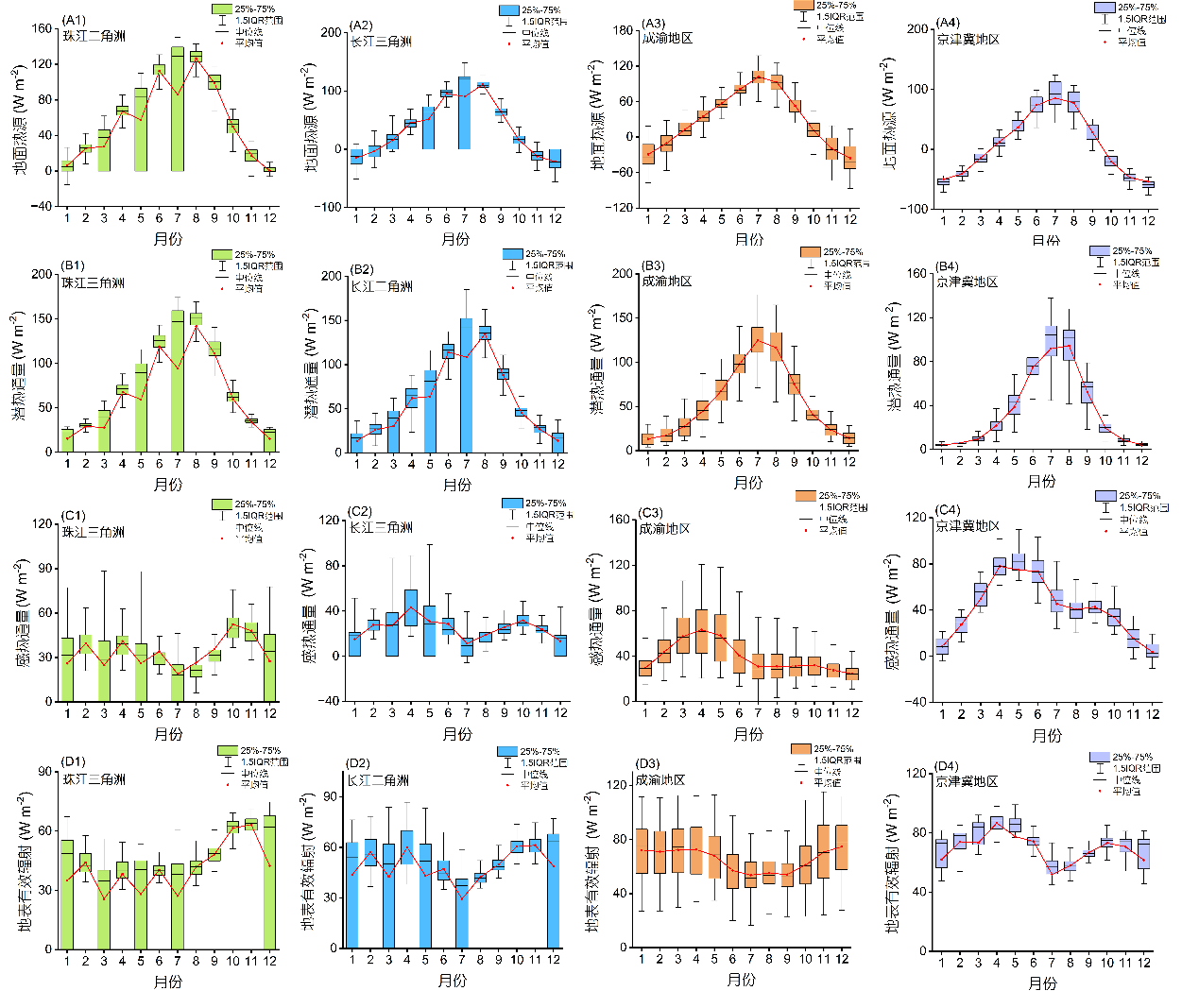 研究表明,四個城市群的地面熱源均呈現(xiàn)“夏強冬弱”的季節(jié)性特征,區(qū)域分布差異顯著。珠三角熱源強度最強,但存在局部低值區(qū);長三角熱源高值主要沿江分布,大城市熱源相對偏低;成渝地區(qū)熱源高值集中于盆地西部,且波動較大;京津冀地區(qū)則表現(xiàn)為“南強北弱”的格局,北部冬季易轉為熱匯。這些差異反映了地形、氣候條件與城市化水平的綜合調(diào)控作用。