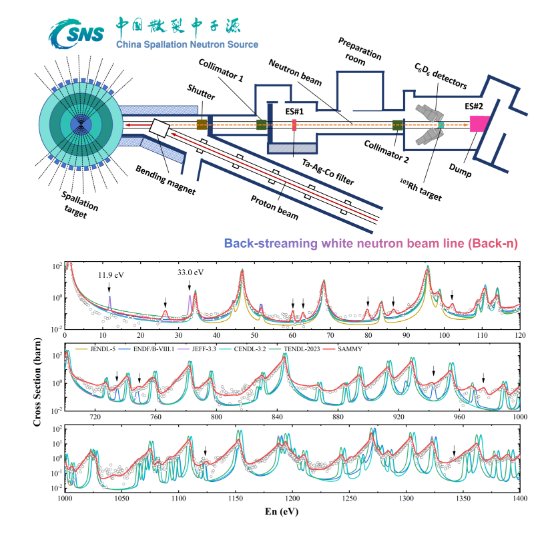 圖1: CSNS Back-n束線中子俘獲反應實驗布局、103Rh(n,γ)反應實驗截面值與不同評價庫的比較
