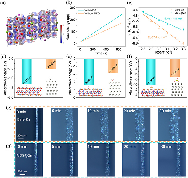 圖3. (a) MDS的靜電勢(ESP)分布圖。(b) 電化學石英晶體微天平(EQCM)測試中,有無MDS層時電鍍過程的質(zhì)量變化圖。(c) 基于電荷轉(zhuǎn)移電阻計算的裸鋅和MDS@Zn陽極的活化能。(d)、(e)、(f) 分別為Zn2+、H2O和SO42–在裸鋅和MDS陽極(002)晶面上的吸附能圖。(g) 裸鋅陽極和 (h) MDS@Zn陽極在10mA cm–2電流密度下鋅沉積過程的原位光學顯微鏡圖像。