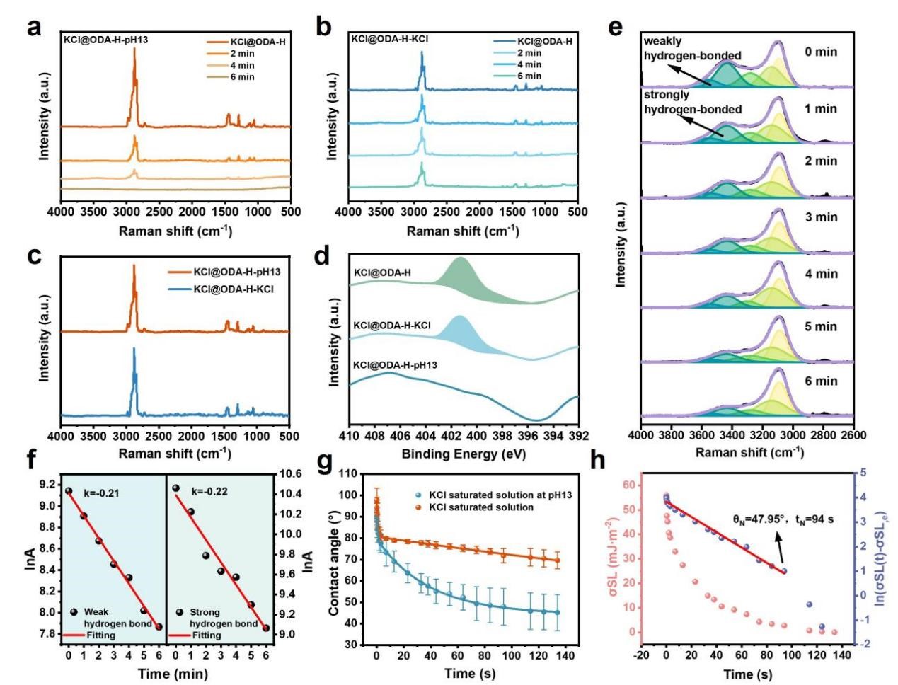 另一項工作則通過以堿度調(diào)控方式提高ODA-H的原位脫附效率,其KCl表面ODA-H的脫附率達到87%。MD模擬計算表明,OH?導(dǎo)致親水基團(-NH3+)去質(zhì)子化,破壞了ODA-H與KCl表面之間的靜電相互作用,并在堿性條件下促使親水基團脫離KCl表面。該機制可通過以下三個遞進階段系統(tǒng)闡明:(1)OH?誘導(dǎo)ODA-H脫附;(2)固–液界面張力降低;(3)擴散過程加速,從而促進OH?向吸附位點的高效傳輸。
