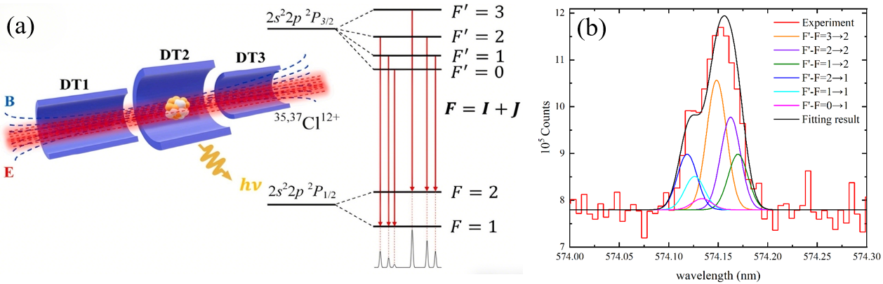 由于高電荷態(tài)離子制備條件苛刻、多電子體系能級(jí)結(jié)構(gòu)復(fù)雜,對(duì)其開展高精度實(shí)驗(yàn)測(cè)量長(zhǎng)期面臨較大的技術(shù)挑戰(zhàn)。研究團(tuán)隊(duì)依托高溫超導(dǎo)電子束離子阱(EBIT)實(shí)驗(yàn)平臺(tái),首次成功觀測(cè)到類硼氯離子(Cl12+) 中2P1/2和 2P3/2能級(jí)的超精細(xì)分裂結(jié)構(gòu),并通過高分辨譜線擬合獲得了相應(yīng)的超精細(xì)結(jié)構(gòu)常數(shù),利用第一性原理理論計(jì)算,成功提取該離子原子核的磁偶極和電四極超精細(xì)結(jié)構(gòu)常數(shù)。該工作為中等原子序數(shù)高電荷態(tài)離子超精細(xì)結(jié)構(gòu)的理論研究提供了重要實(shí)驗(yàn)基準(zhǔn)。