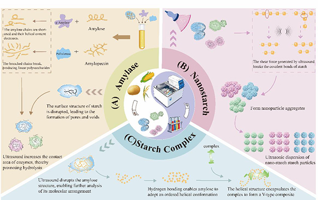 近日,中國(guó)科學(xué)院蘭州化學(xué)物理研究所天然藥物與化學(xué)測(cè)量研究中心食品化學(xué)與安全檢測(cè)團(tuán)隊(duì)發(fā)表了關(guān)于抑制淀粉回生方面的綜述文章,系統(tǒng)總結(jié)了超聲波輔助淀粉改性領(lǐng)域的最新研究進(jìn)展,為綠色、高效的淀粉功能化改性技術(shù)提供了重要參考。該論文深入探討了超聲波參數(shù)優(yōu)化、結(jié)構(gòu)-性能關(guān)系解析及協(xié)同改性策略,展現(xiàn)了超聲波技術(shù)在淀粉改性領(lǐng)域的廣闊前景。