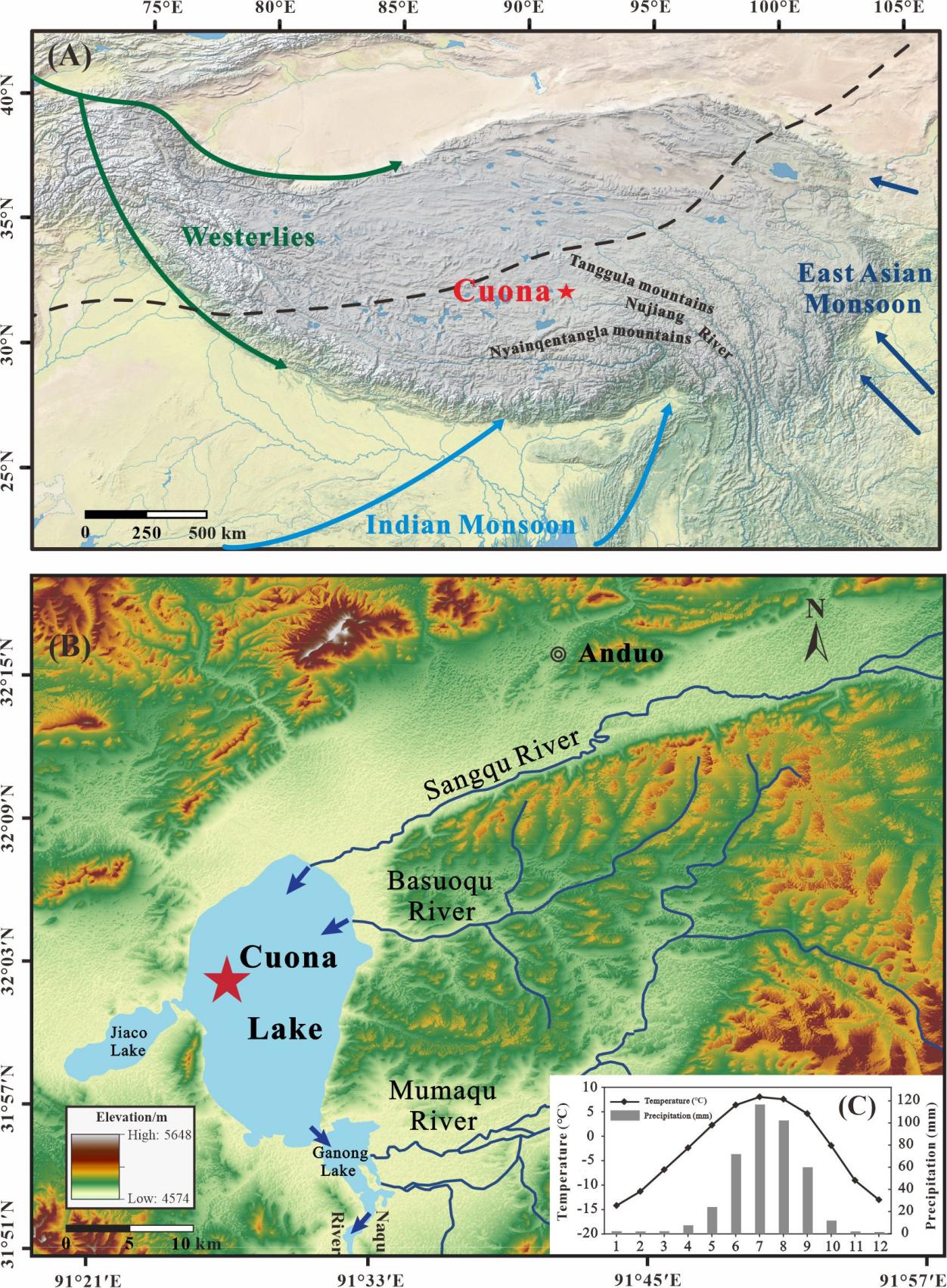 青藏高原中部錯那湖地理背景及CN12/01鉆孔位置