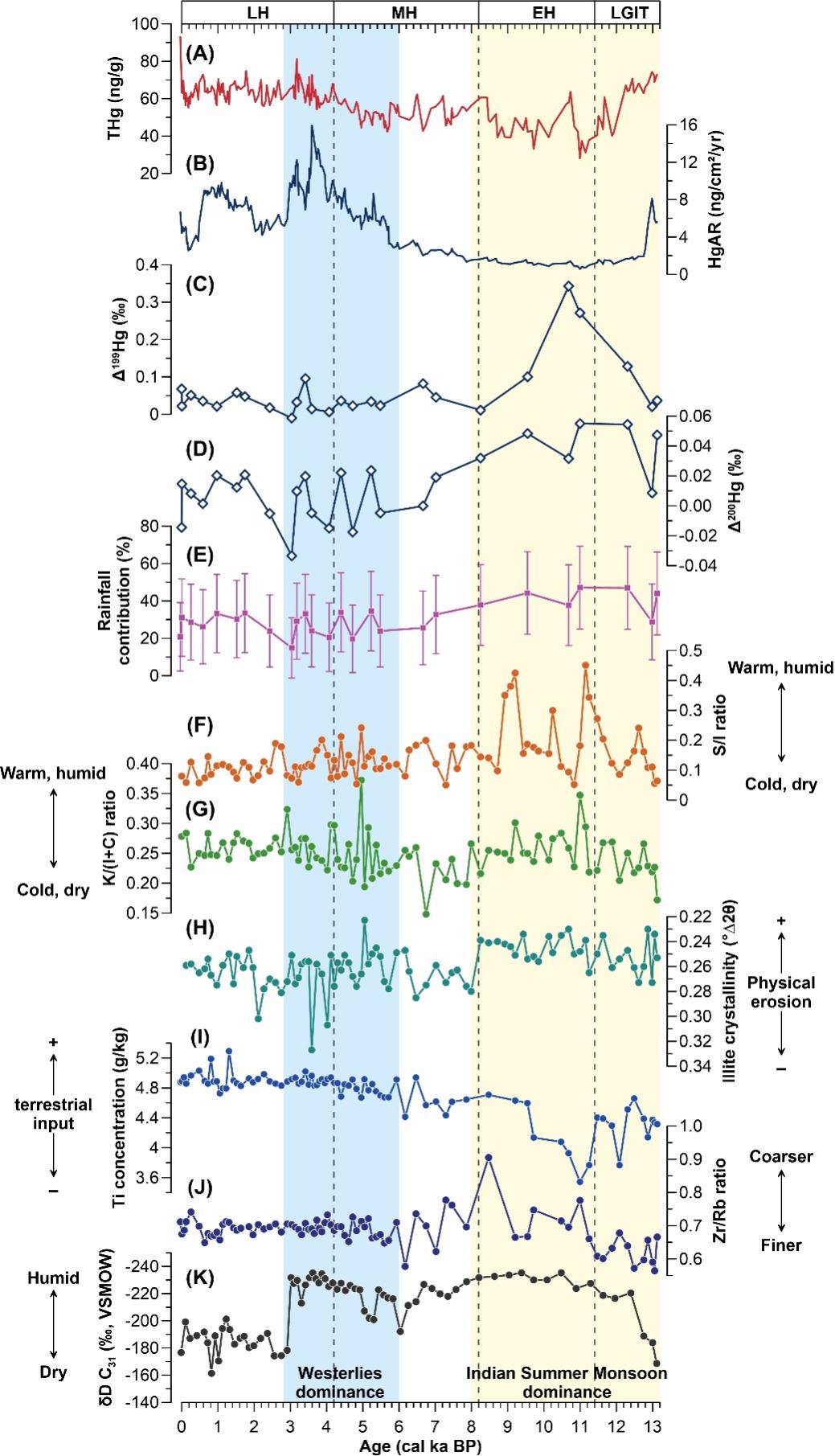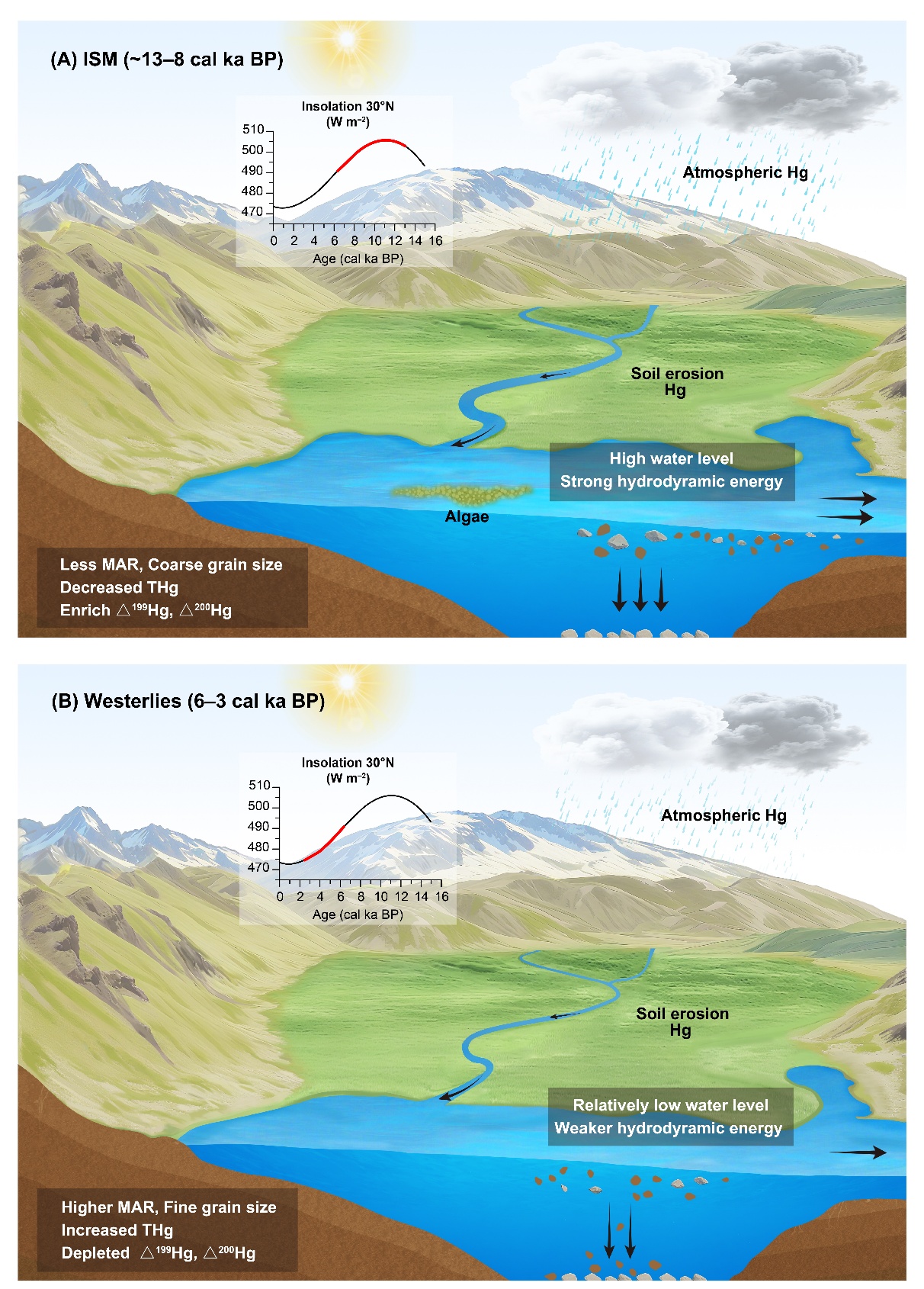 研究發(fā)現(xiàn),錯那湖沉積物中的汞主要來源于大氣降水輸入和流域剝蝕輸入。早全新世時期(~13–8 ka BP),印度夏季風(fēng)強盛,降水輸入貢獻(xiàn)率相對更高,占比達(dá)41 ± 7%,但總汞濃度(52.03 ± 12.74 ng/g)和沉積速率(1.94 ± 1.67 ng/c㎡/yr)均處于較低水平。進(jìn)入中晚全新世時期(6–3 ka BP),隨著印度夏季風(fēng)減弱、西風(fēng)影響增強,降水輸入貢獻(xiàn)比降至26 ± 7%,而汞沉積速率則大幅提升至8.33 ± 3.08 ng/c㎡/yr,較早全新世時期顯著增高。