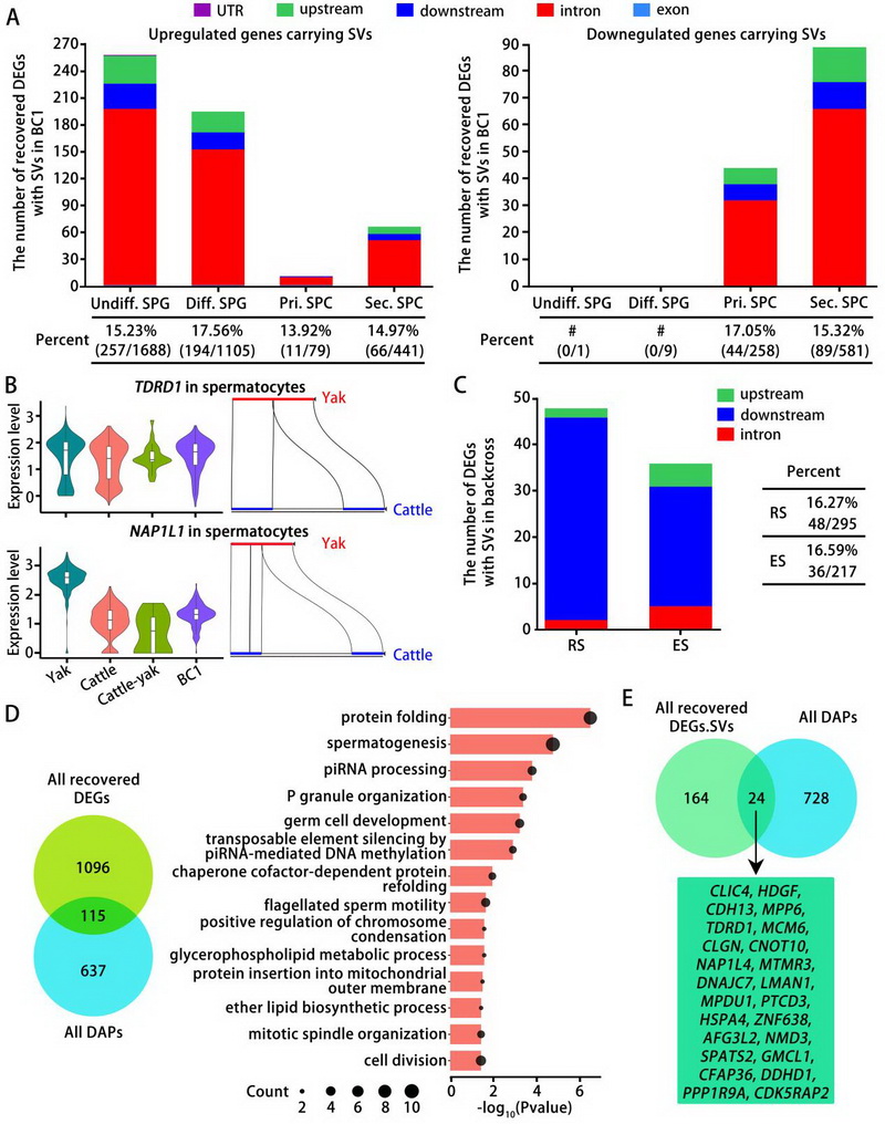 論文代表圖2:普通牛、牦牛、犏牛及BC1各類生殖細胞亞型中攜帶基因組結構變異的差異表達基因。A) 柱狀圖顯示在犏牛精原細胞和精母細胞各亞群中,具有結構變異且表達上調或下調、但在BC1中表達得以恢復的基因數量。B) 代表性基因的小提琴圖及其結構變異的示意圖。C) 柱狀圖顯示與牦牛和普通牛相比,在BC1各類精子細胞亞型中攜帶基因組結構變異的差異表達基因數量。D) 對BC1精母細胞中所有表達水平恢復的差異表達基因,與犏牛精母細胞中的差異豐度蛋白進行韋恩圖分析及GO富集分析。E) BC1精母細胞中所有表達恢復的差異表達基因、具有結構變異的差異表達基因,以及犏牛精母細胞中所有差異豐度蛋白的韋恩圖分析。