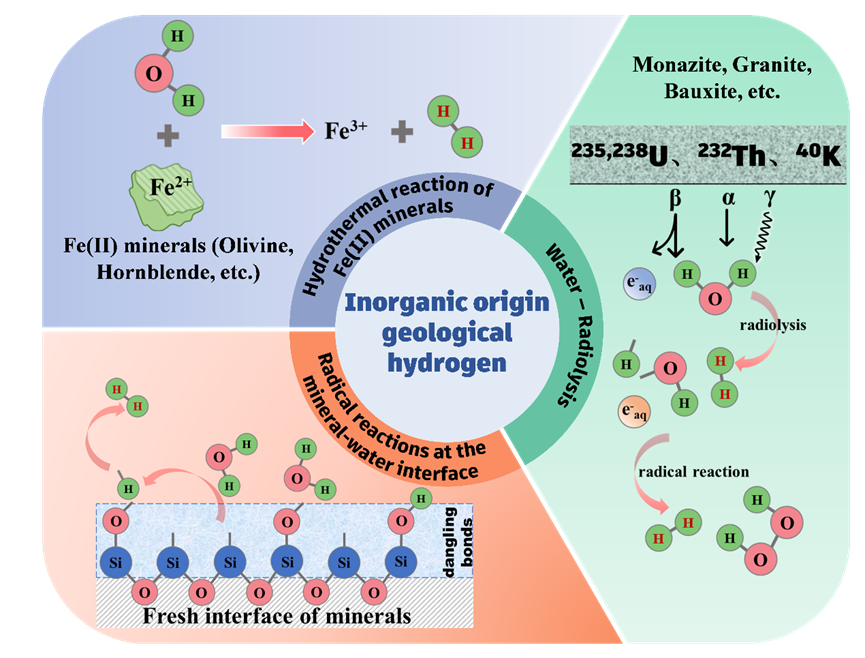 研究指出,含F(xiàn)e(II)礦物水熱反應(yīng)、水輻射分解以及礦物-水界面自由基反應(yīng)是無機(jī)來源地質(zhì)氫的三種主要形成途徑,其全球年產(chǎn)氫率分別為0.2×1011–6.3×1012 mol/year,1.6×1010–1.35×1013 mol/year,和1.1×108–2.5×1010 mol/year。含F(xiàn)e(Ⅱ)礦物水熱反應(yīng)的核心機(jī)制是Fe(II)的電子轉(zhuǎn)移與礦物相變,主要受溫度控制;水輻射分解則通過天然放射性元素輻照水分解生成氫,主要受輻射類型和劑量影響;而礦物-水界面自由基反應(yīng)主要來源于界面水分子在不飽和配位位點(diǎn)反應(yīng)形成自由基并進(jìn)一步生成氫氣,其主要受礦物類型控制。上述反應(yīng)還受到共存離子、水溶氣體等地質(zhì)環(huán)境條件的共同調(diào)控。