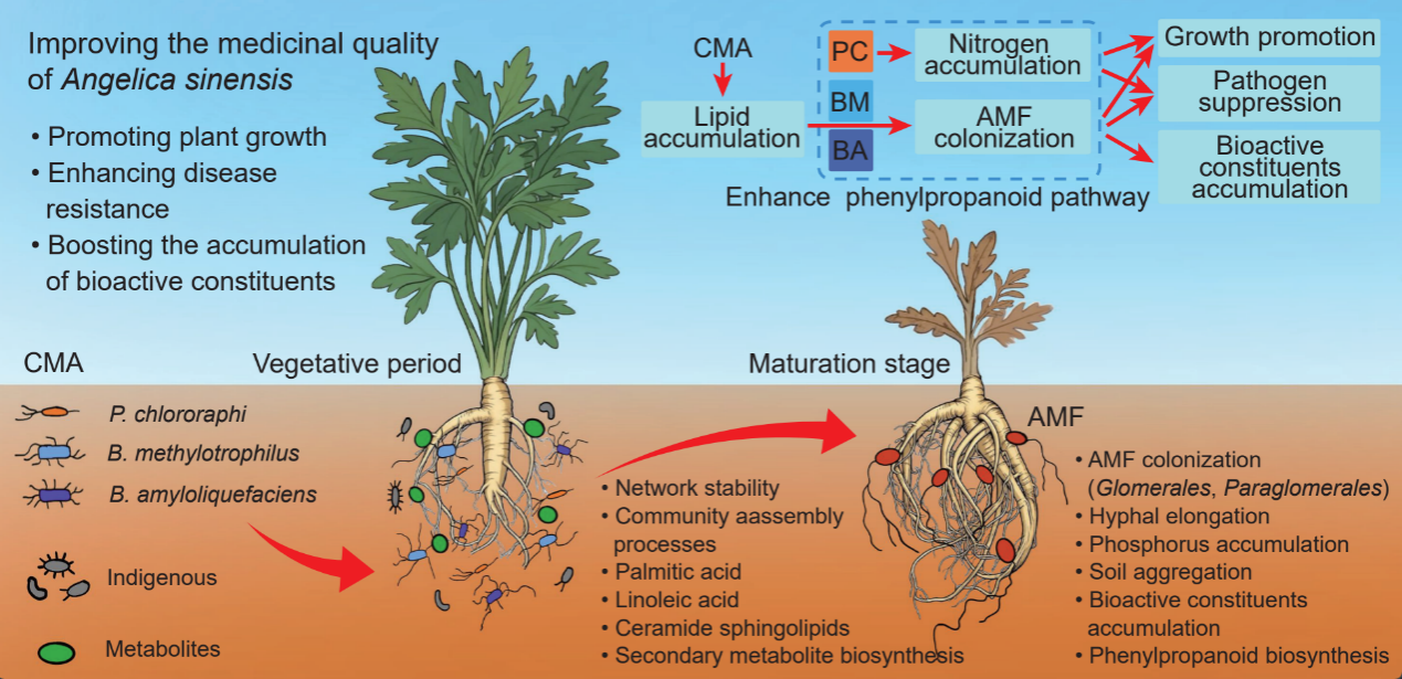 兩項研究分別從激素與苯丙烷代謝調控以及“功能互補菌群—AMF協同作用”兩個層面,揭示了微生物介入對當歸生長和藥用成分積累的調控機制,為“生防菌調控—宿主響應—品質形成”提供了重要的實驗依據,并為相關機制研究奠定了堅實基礎。