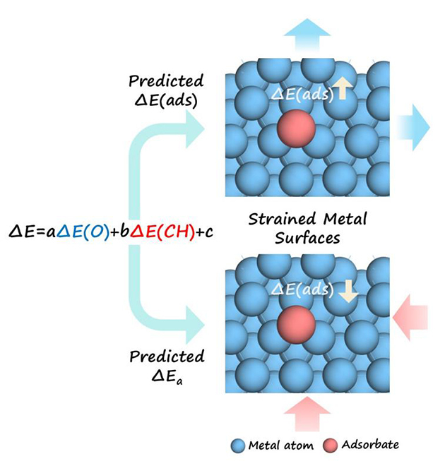 在多相催化反應中,活性金屬表面的電子結構對反應物分子的吸附與活化轉化起著關鍵作用。近年來的研究表明,通過對金屬晶格施加拉伸或壓縮應變,可有效調控其表面電子結構,顯著改變反應物及關鍵中間體的吸附行為,進而實現對催化活性與選擇性的精準調控。目前,應變工程已成為設計高性能催化劑的重要策略。然而,不同金屬體系和不同吸附物對應變呈現出復雜且差異化的響應規(guī)律,至今仍缺乏可定量描述應變誘導能量變化的普適性標度關系,制約了高效催化劑的理性設計與精準構筑。