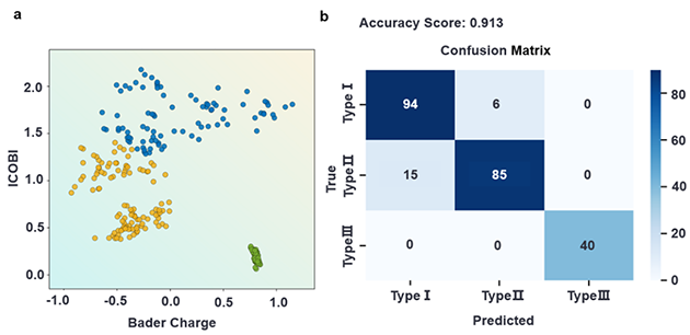 團隊進一步引入機器學習分類方法,以ICOBI(晶體軌道鍵指數)和Bader電荷轉移量為特征,訓練支持向量分類器。五折交叉驗證表明分類器達到較高準確率,在不依賴電負性概念的前提下,從電子結構層面揭示了共價鍵合與離子鍵合特性之間的區(qū)別是不同吸附物應變響應差異的物理本質。