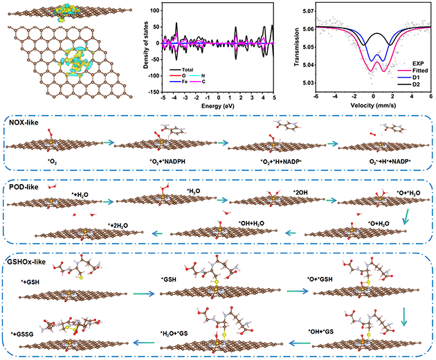 近日,中國科學院蘭州化學物理研究所天然藥物與化學測量研究中心海軍研究員團隊,發(fā)展了一種以氧化石墨烯為二維支撐載體的Fe單原子納米酶(FeNC SAzymes)。與傳統(tǒng)平面Fe-N4構型相比,軸向O配位的引入有效打破了對稱配位限制,增強了活性中心的電子調(diào)控能力(圖1)。此外,密度泛函理論計算解析該關鍵活性能有效降低多酶反應途徑的能量勢壘,從而提升NOX、POD和GSHOx等多酶樣級聯(lián)相關過程的反應效率,為后續(xù)觸發(fā)后放大效應提供基礎(圖2)。FeNC SAzymes結構設計使Fe中心的電荷分布和d軌道電子態(tài)密度得到優(yōu)化,從而提升其對反應中間體的吸附與活化能力以及電子轉移效率,為實現(xiàn)TME識別、可視化檢測和響應研究提供了新方法。