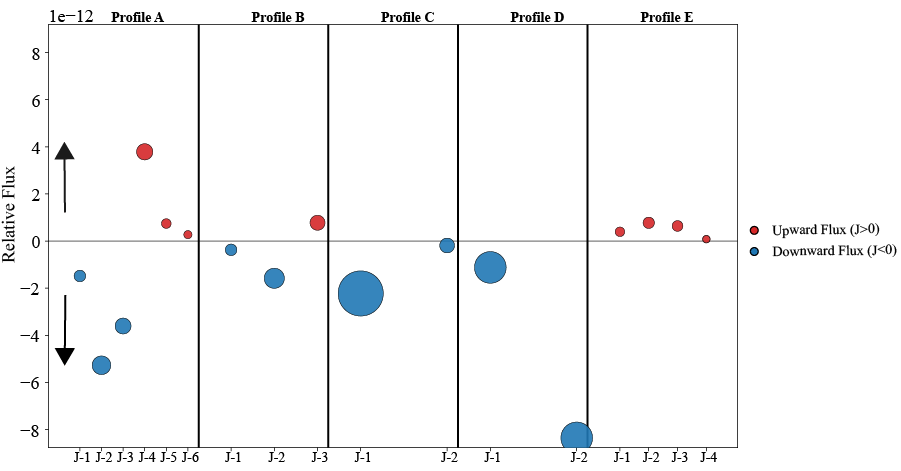 多年凍土剖面中HCBD遷移的垂直分布。圖中顏色表示HCBD的遷移方向(藍(lán)色向上,紅色向下),圓圈大小反映遷移強(qiáng)度。