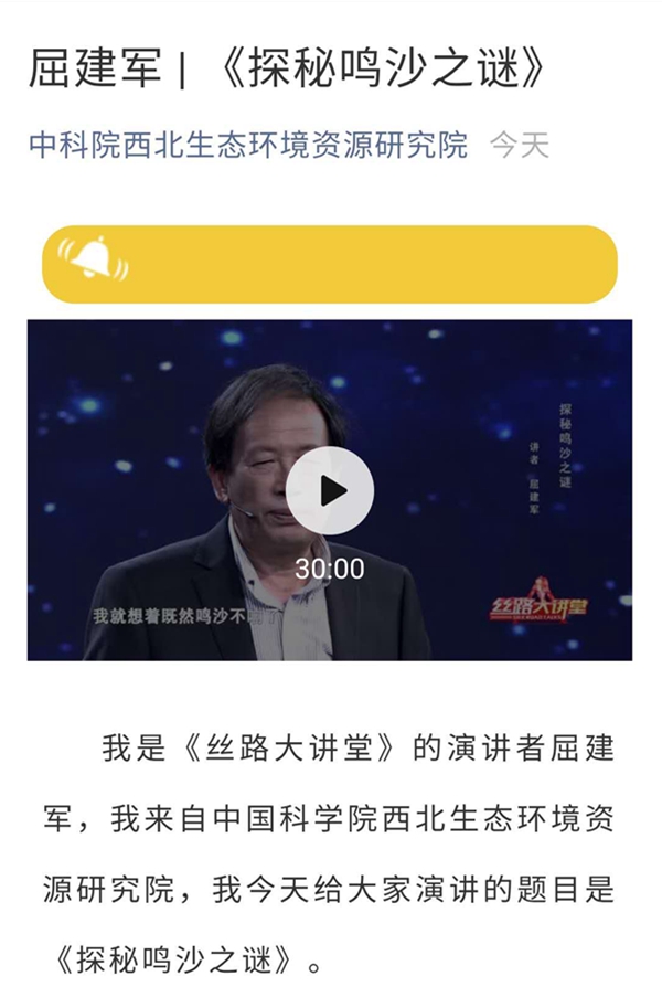 在西北研究院微信公眾號(hào)推送了屈建軍研究員主講的《探秘鳴沙之謎》科普?qǐng)?bào)告,報(bào)告講述了其研究團(tuán)隊(duì)通過長(zhǎng)年的科學(xué)研究,發(fā)現(xiàn)自然沙粒表面的多孔(坑)狀結(jié)構(gòu)所構(gòu)成的共鳴腔,是鳴沙發(fā)聲的關(guān)鍵所在。就像掏耳朵一樣,把堵在孔洞里的臟東西洗干凈,鳴沙就“復(fù)聲”了,實(shí)現(xiàn)了鳴沙的修復(fù),成功復(fù)活了鳴沙自然現(xiàn)象,讓失聲的沙子再“唱歌”。