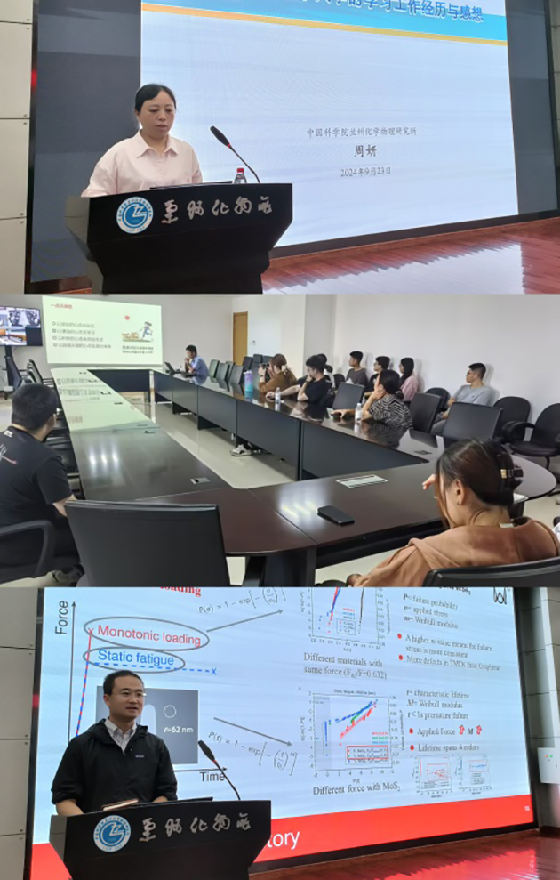 2019年度中國科學院公派留學訪學項目獲得者、蘭州潤滑材料與技術(shù)創(chuàng)新中心周妍博士和王超博士,2022年度科技部青年科技人才中長期出國(境)培訓項目獲批人、潤滑材料重點實驗室嚴云峰博士分別圍繞摩擦誘導界面結(jié)構(gòu)對稱破缺機理研究,熒光成像原位研究潤滑油在多孔含油材料及摩擦界面處的流動與分布機制研究,單層MXene的制備、破壞力和疲勞的研究及取得的成果進行了報告,介紹了國外學校、合作者及所在團隊的概況,分享了國外實驗室和團隊的先進管理經(jīng)驗、良好的工作習慣、外方機構(gòu)選擇、項目申報中的注意事項以及在外期間面對的困難挑戰(zhàn)和學習生活趣事等。